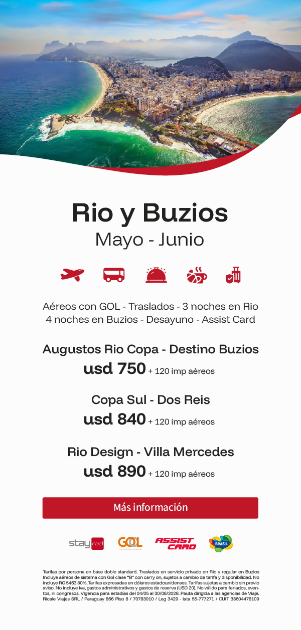 Tarifas por persona en base doble habitación Standard. Traslados en servicio privadio en Rio y regular en Buzios con horarios predeterminados por el proveedor. Incluye aéreos de sistema con Gol clase "B" con carry on, sujeto a cambio de tarifa y disponibilidad.