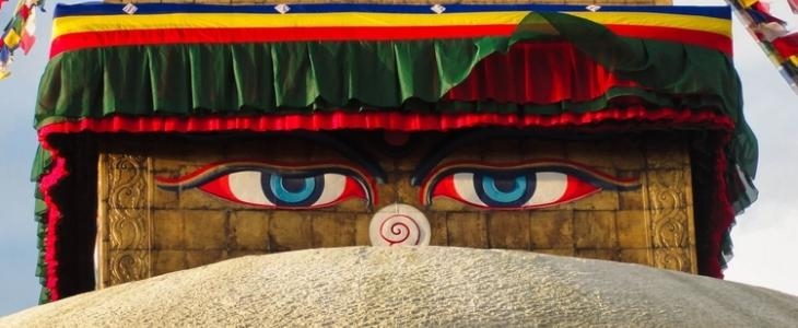 Visite el templo Boudhanath, otro de los sitios de la UNESCO de Katmandú y uno de los sitios budistas más sagrados de Nepal. Ubicada a unas 7 millas (11 kilómetros) del centro de Katmandú en las afueras al noreste de la ciudad, la estupa de Boudhanath domina el horizonte. A lo largo del día, se puede ver a los peregrinos circunvalar la estupa cantando mantras, algunos completando el circuito mientras se postran en cada paso. Los peregrinos continúan dando vueltas en la noche cuando el templo está iluminado por lámparas de mantequilla. Cualquiera es libre de unirse, pero recuerde caminar alrededor de la estupa en el sentido de las agujas del reloj y también girar las ruedas de oración en el sentido de las agujas del reloj. Es la estupa más grande no solo en el valle de Katmandu, sino también en el sur de Asia.